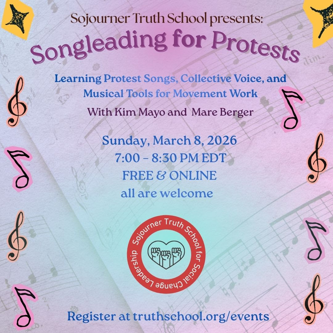 Sunday, March 8 at 7-8:30pm (EDT) Course description: “Singing brings us joy, connects us to others, heals our bodies and minds, and helps sustain us in movement work. In this workshop, we will learn easily shareable songs for protests and resistance work and we will learn tools on how to teach them to crowds in the moment. We will also learn how to turn a speaking chant into a song so it is easier on our voices to keep repeating. We will also learn how to use singing as a tool for de-escalation, how songs can be a shield and also help calm people down who become aggressive. Music is amazing! Everyone welcome, join us!”