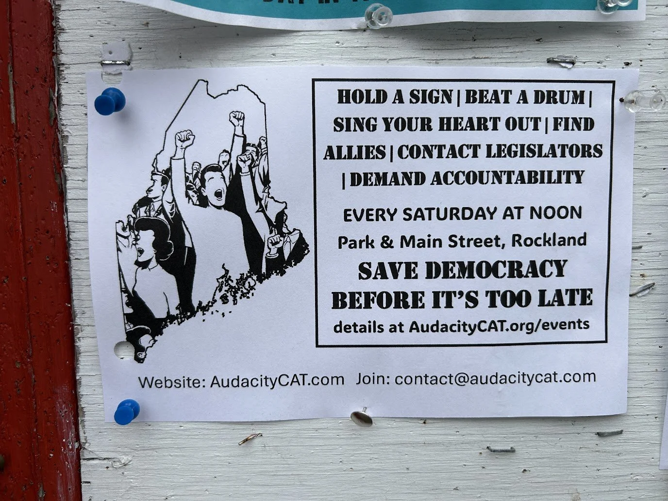 In Rockland, residents of towns from throughout the Midcoast area will meet at the corner of Park and Main streets at noon, rehearsing songs of democracy for a half hour that they have been practicing for the past two weeks.